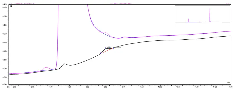 Figure 2: Overlaid chromatogram of nitrite standard (black), spiked (pink) and unspiked (blue) sample containing high level of chloride.
