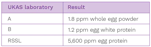 To collect evidence that the ELISA test they were using was not suitable, the manufacturer commissioned some testing of their egg-containing product, with a theoretical protein content of approximately 6,000 ppm egg protein, to three different UKAS accredited laboratories: RSSL, the manufacturer’s existing laboratory and a third laboratory (previously uninvolved in the incident). The results are shown below: