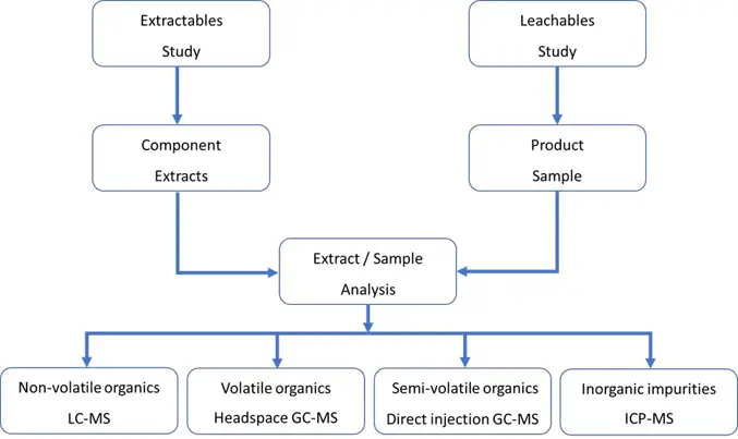 The extractables study identifies which components may release mobile species during the manufacture and storage of a pharmaceutical product. Components are extracted with a range of solvents in isolation of the pharmaceutical product.