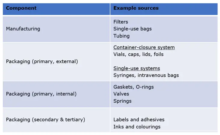 A wide range of materials comprise the components used to manufacture and store a pharmaceutical product, summarised in Table 1.