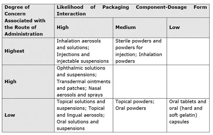 The route of administration and the degree of product-packaging contact help determine SCTs. To assign risk from leachable species to the pharmaceutical product under investigation, the FDA developed the following matrix:2