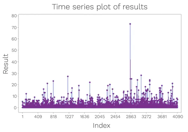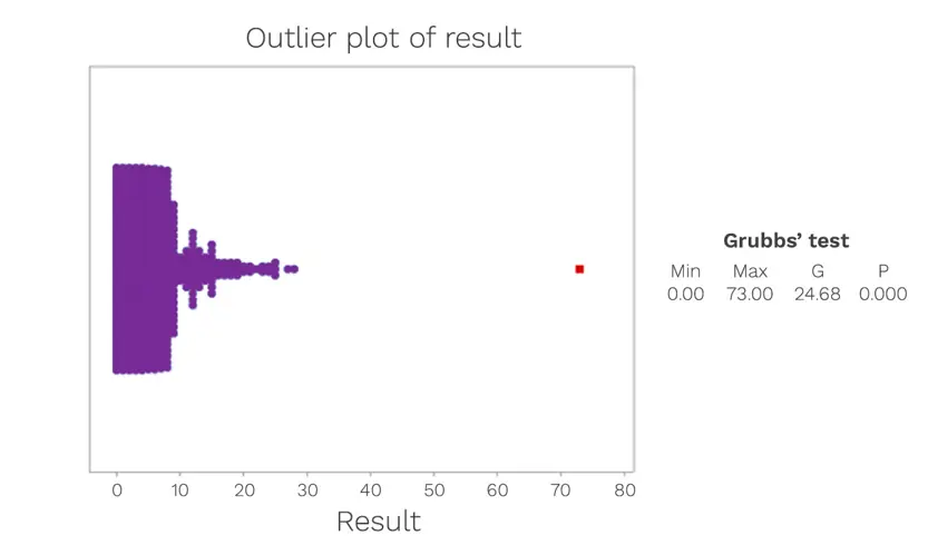 The presence of outliers can be assessed using Grubbs’ Test. This test can be used to detect outliers in a univariate data set. The data set shown in Figure 2 is formed of a relatively close set of associated numbers, with only one evident outlier value. It is important to note that the Grubbs’ Test is an iterative test and after the outlier has been removed from the data set, the test is run successively until no further outliers are detected.
