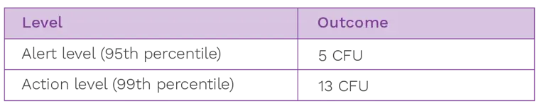 With the lower level, should the data set be extremely good, caution is also required. For example, setting a Grade C contact plate alert level at 1 CFU/25cm2 might be unrealistically low in terms of being unrepresentative of what an area is capable of over the longer term. It may also be that reacting to a pattern of three 1 CFU creates a pattern of zero results which might not add value when performing an investigation. Furthermore, there are concerns about setting a limit so low in relation to possible errors arising from sampling or testing. Here the results obtained may be more prone to low level contamination arising from sampling or testing (again with a count of 1 CFU).