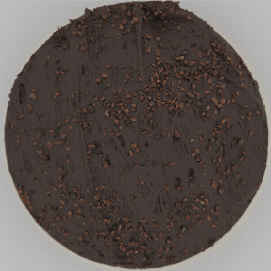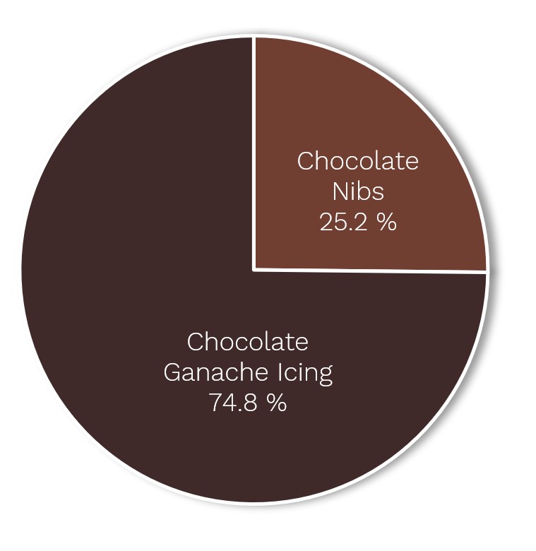 Chocolate cake: Two components - ganache icing and sprinkled chocolate nib topping. Our analysis found that around 25% of the visible surface was covered with chocolate nibs and 75% with chocolate ganache icing.