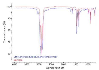 Figure 3: FT-IR spectrum of the sample material (red) compared with a library ethylene propylene diene monomer spectrum (blue).