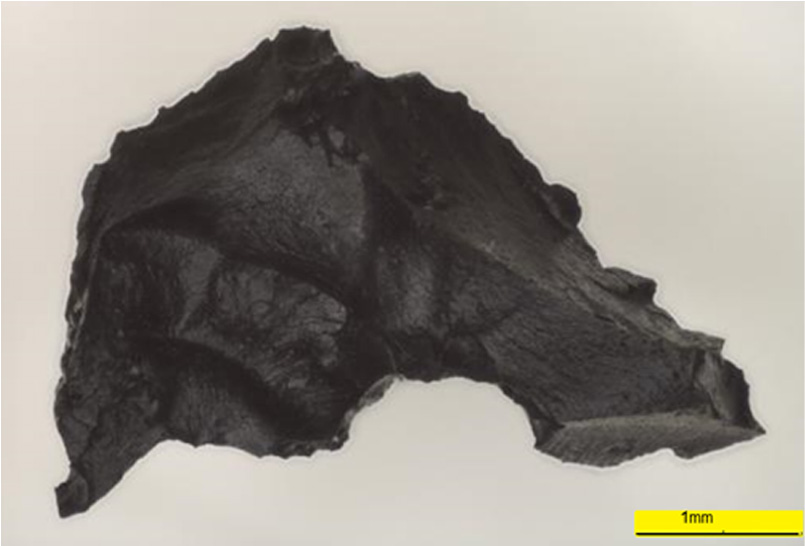 We used Fourier transform infra-red (FT-IR) spectroscopy to examine a subsample of the black fragment. The resulting spectrum showed that the sample correlated with a library Ethylene Propylene Diene Monomer (EPDM). Otherwise known as a common type of rubber.