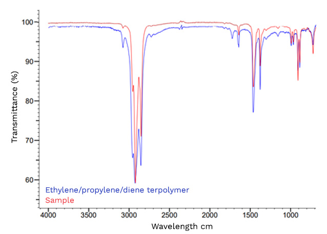 Figure 3: FT-IR spectrum of the sample material (red) compared with a library ethylene propylene diene monomer spectrum (blue).