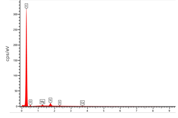 This was confirmed by a further test. X-ray microanalysis found that the sample contained a high level of carbon with oxygen, magnesium, silicon, sulphur and calcium also present. This was consistent with a polymeric material with fillers.