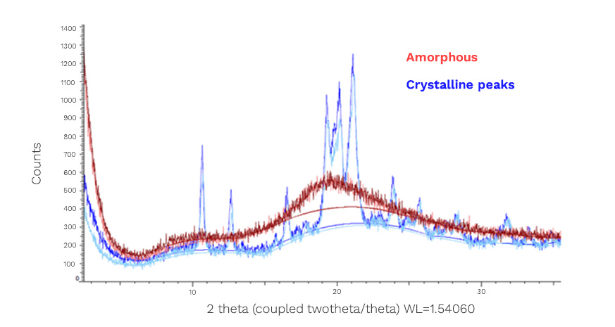 This analysis was carried out at the start of shelf life. We then subjected the samples to various controlled storage regimes, such as relative humidity, elevated temperature and reduced temperature. By comparing the different sets of data, we were able to assess the effect of different condition on the crystalline state during shelf life.