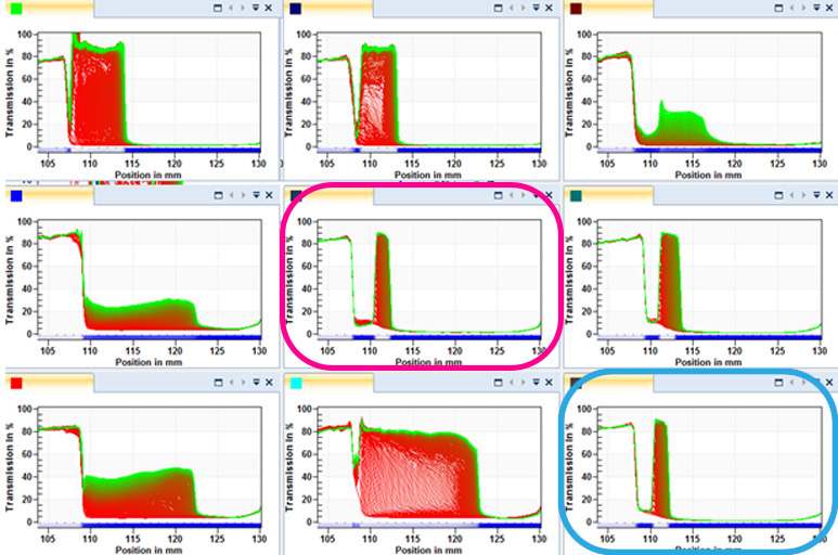 We used the LUMiSizer, an analytical centrifuge combined with NIR light extinction measurement, to evaluate the stability of numerous reformulated fillings against the originals. This enabled us to track the development and movement of any phase interfaces, such as changes caused by sedimentation (see figure 1).