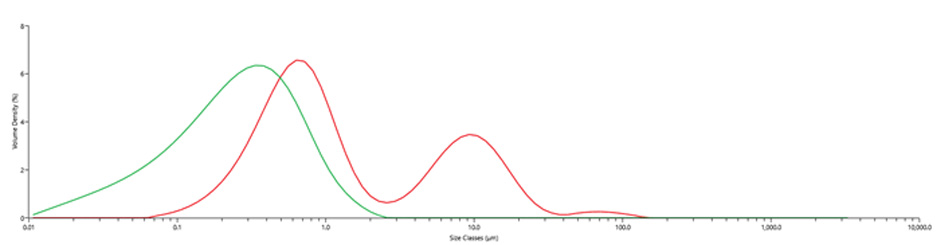 Figure 3. Laser diffraction droplet size analysis of initial emulsion test formulation (red), and final emulsion formulation (green).