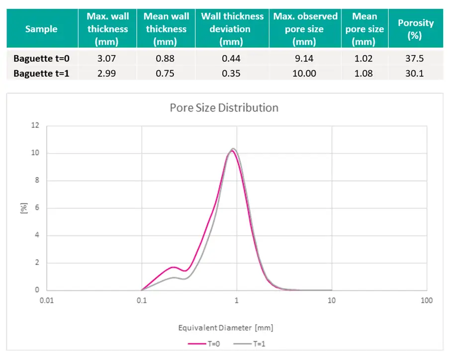 Pore size distribution was comparable between the two time points; however, the aged baguette had a slightly larger maximum pore size (due to the collapse of bubbles and large internal crack propagation).