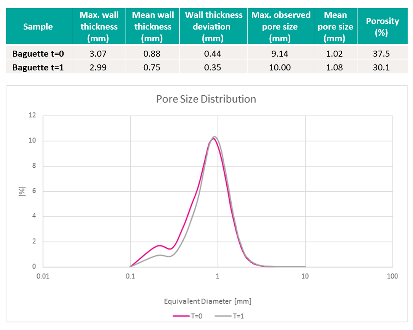 A white bread baguette was analysed at day 1 (T=0, fresh). To accelerate starch retrogradation, the baguette was then placed in a fridge before analysis on day 7 (T=1, stale). The structural thickness and pore size were calculated, as well as % porosity by total volume.