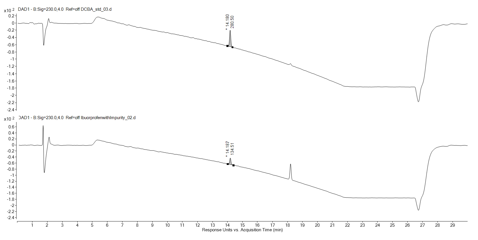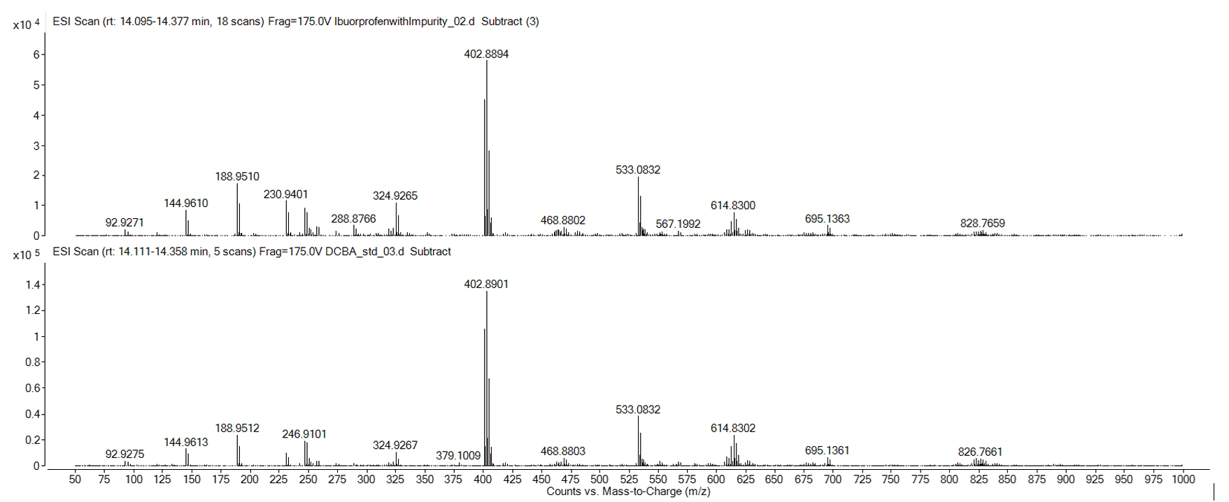 Figure 3 shows both the impurity and DCBA mass spectra. The resulting mass spectra displays the same mass ions and a very similar profile, thus confirming the impurity as DCBA. The standard also eluted at the same retention time as the impurity, providing further confirmation (Figure 4).