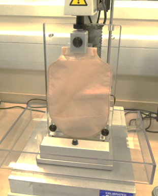 The ostomy bags were attached to the rigid, transparent plates and filled with a solution dyed red to allow clear visibility of any leakage (see Figure 2). A series of Macros were then developed to carry out controlled mechanical testing of the bags. These controls carried out analysis which tested the propensity to leak and determine burst strength across the range of different Ostomy products submitted for testing.