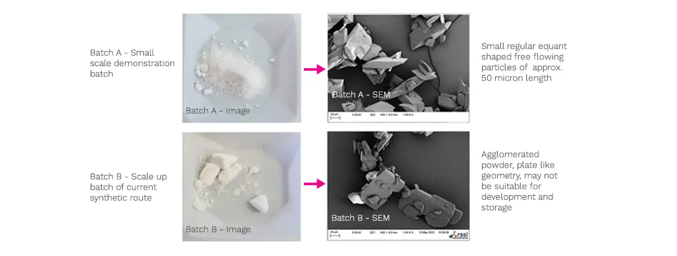 All batches analysed were similar in particle size and polymorphic form. However, analysis demonstrated that the current scale-up resulted in a different morphology (plate-like) to that of the initial small-scale batch, creating highly agglomerated API. This highlighted that the current scale-up of manufacture may not be suitable for future development.