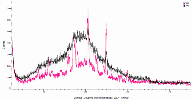 Figure 2 - X-Ray diffractogram of samples, black = t0 and red, t= 2 months