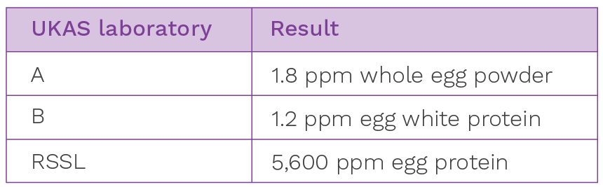 To collect evidence that the ELISA test they were using was not suitable, the manufacturer commissioned some testing of their egg-containing product, with a theoretical protein content of approximately 6,000 ppm egg protein, to three different UKAS accredited laboratories: RSSL, the manufacturer’s existing laboratory and a third laboratory (previously uninvolved in the incident). The results are shown below: