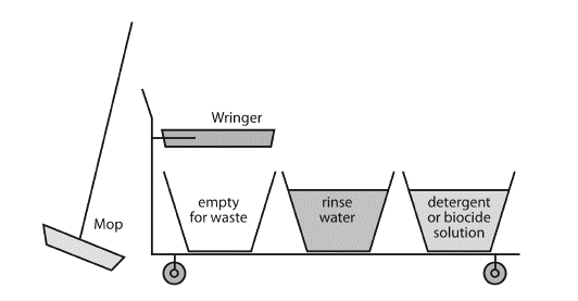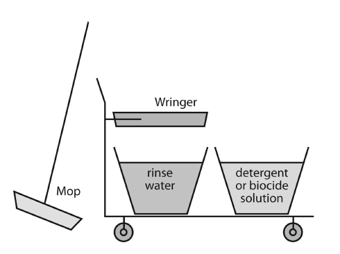 An improvement on this is a ‘double bucket system’. This consists of a bucket containing the cleaning solution and a second bucket containing clean water with a wringer above. The mop is dipped into the cleaning solution and applied to the surface.