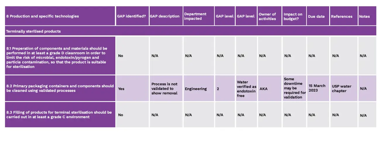 Below is an example of gap analysis using Annex 1’s requirement for the frequency of isolator glove integrity testing and any changes to be determined and scientifically justified.