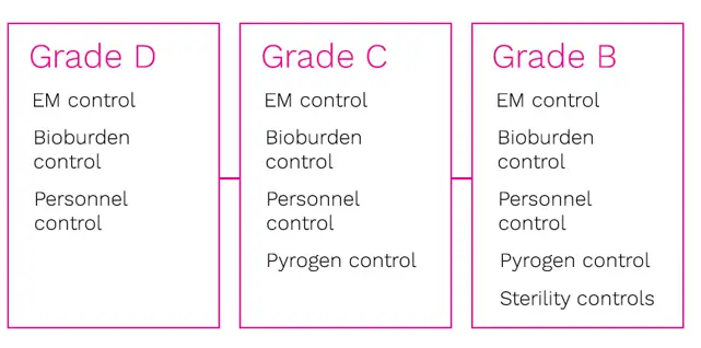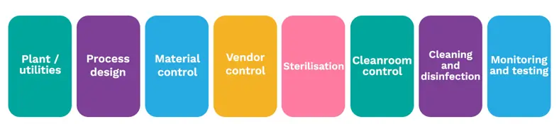 With the horizontal aspect, each primary form of contamination should be addressed not only within the pillar, but between pillars, and with consideration of how contamination could be transferred through different activities and across cleanroom grades. For example, this could be represented as: