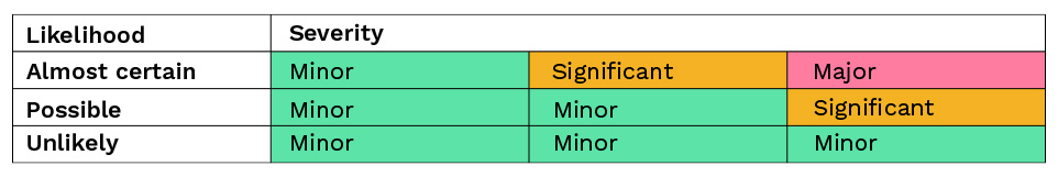 Each gap should be risk assessed using the multitude of different risk tools available. With contamination control it is beneficial to keep the process simple, by grouping outcomes into high, medium and low risk, based on likelihood and severity, such as: