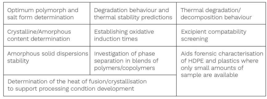 In addition to stand alone thermal analysis, our physical form and formulation experts routinely combine thermal analysis with our other GMP analytical techniques including X-ray diffraction (XRPD), Dynamic Vapour sorption (DVS), water activity and microscopy.