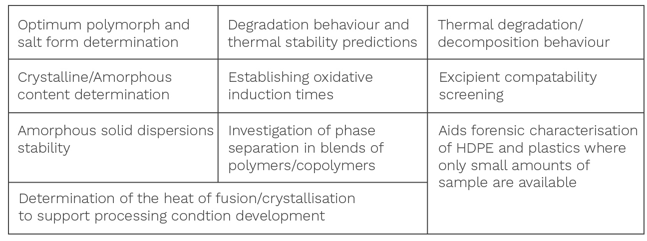 In addition to stand alone thermal analysis, our physical form and formulation experts routinely combine thermal analysis with our other GMP analytical techniques including X-ray diffraction (XRPD), Dynamic Vapour sorption (DVS), water activity and microscopy.